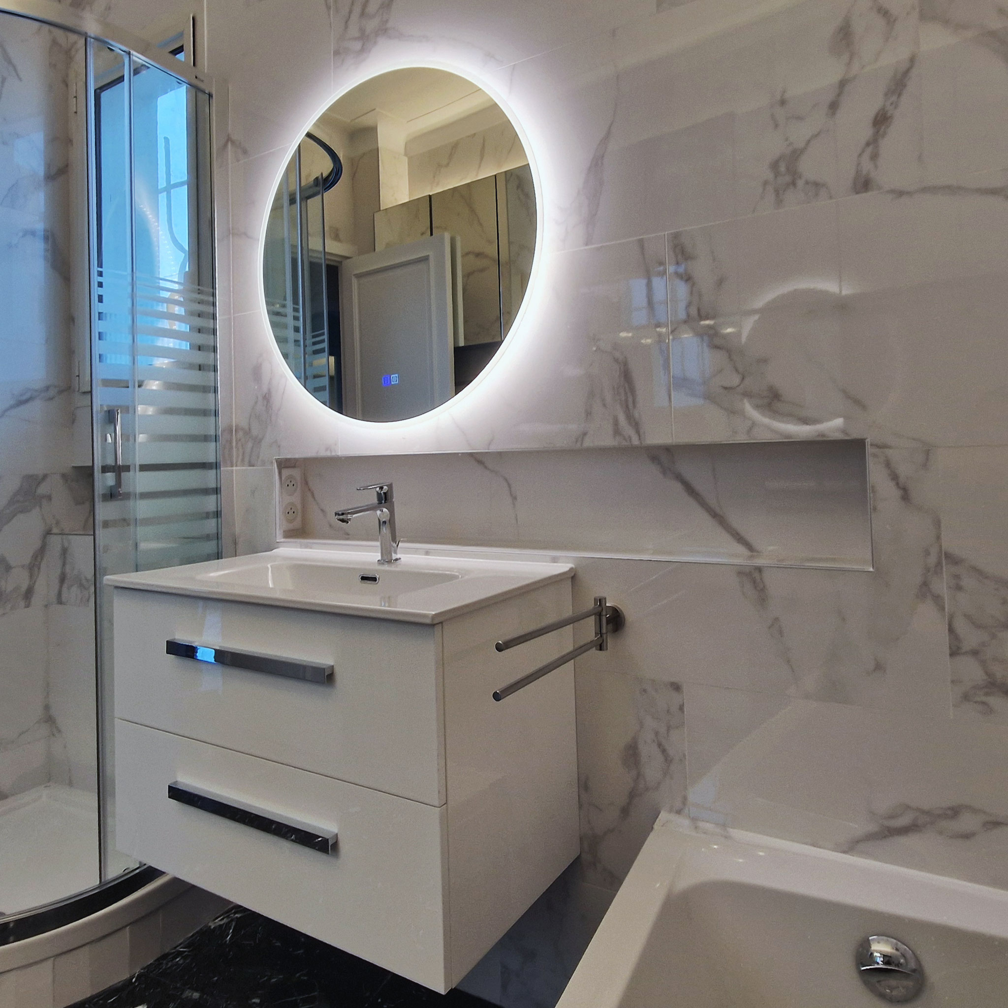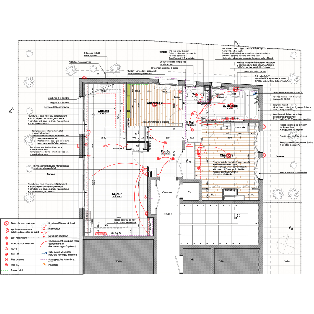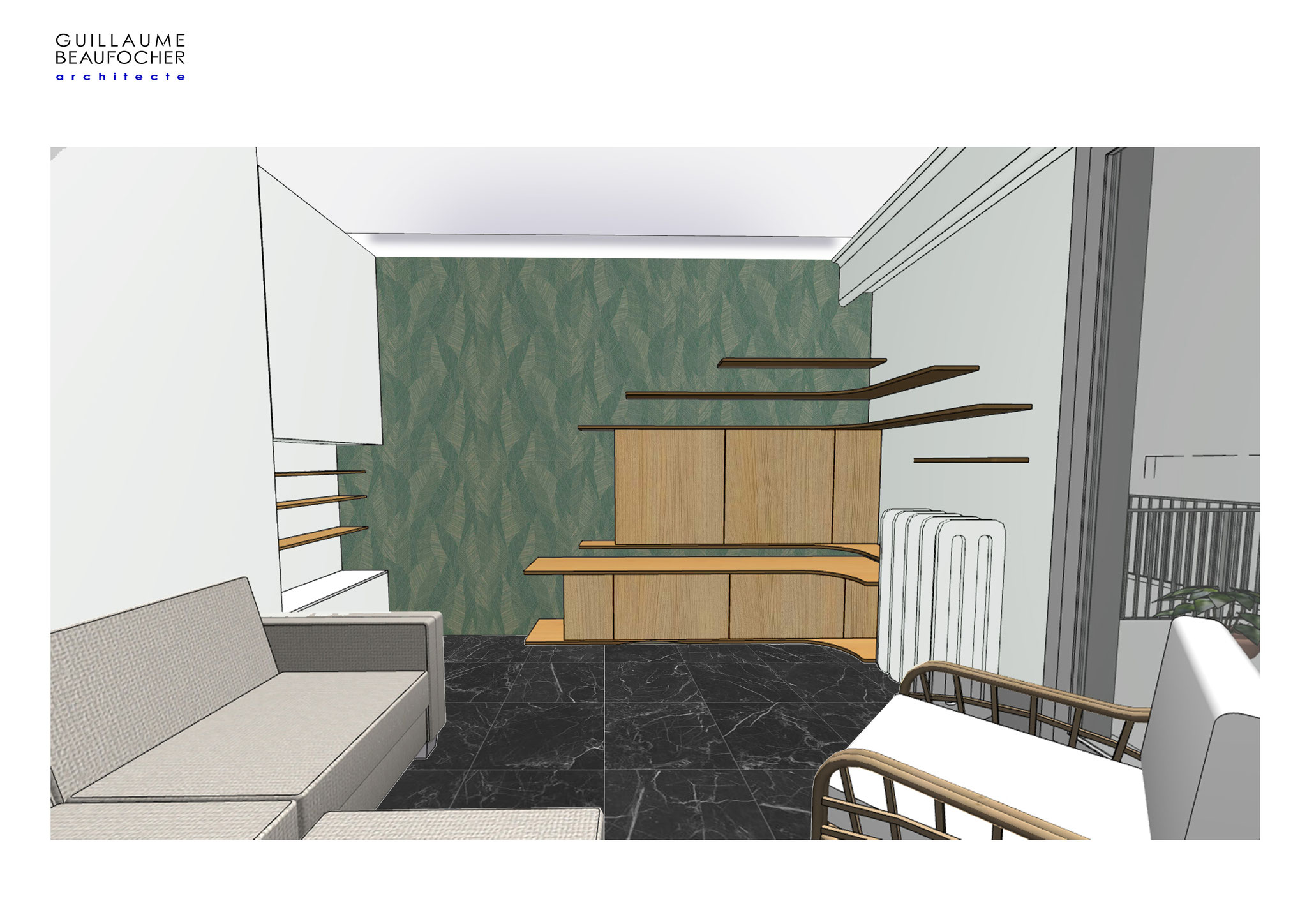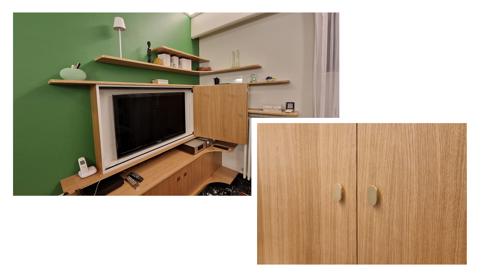 sur-mesure pour recevoir télévision et hi-fi. Rénovation des sols en marbre et en chêne massif, réfection des enduits et peintures. Rénovation complète de la salle de bain. Mise en lumière de